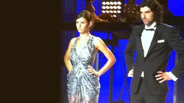 Çekimleri devam eden filmde Akyürek smokinle, Beren Saat ise payetli mini bir elbise ile izleyici karşısına çıkacak.